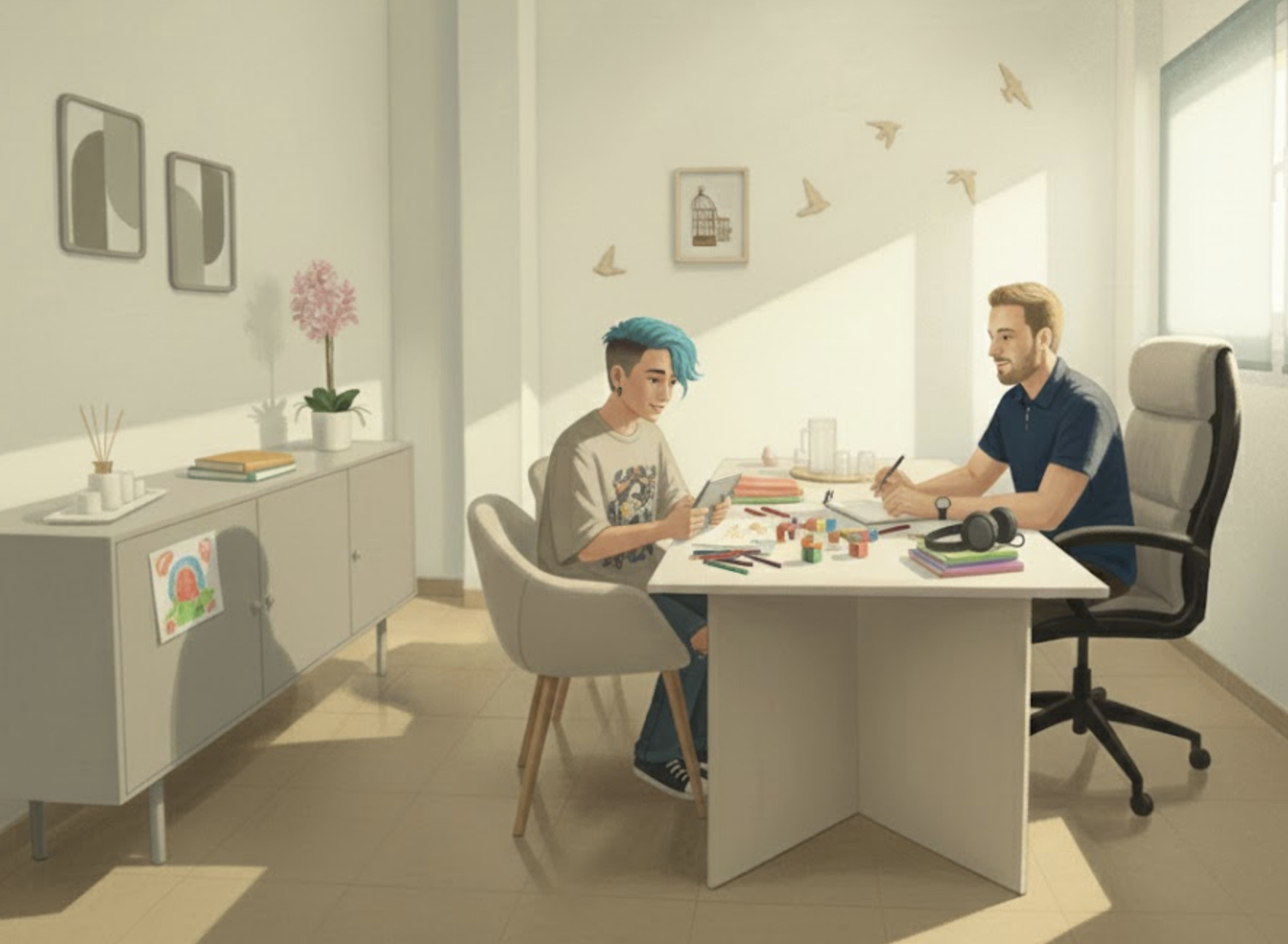 No trabajamos con el niño de forma aislada. Nuestra metodología "Triángulo Terapéutico" implica tres vértices fundamentales: primero, el trabajo directo con el niño o adolescente en consulta, donde aplicamos las intervenciones específicas; segundo, el asesoramiento a la familia para gestionar conductas en casa y reforzar los avances; y tercero, la coordinación con la escuela (tutores, orientadores) para adaptar el entorno educativo a sus necesidades. Esta visión integral garantiza que los cambios se generalicen a todos los ámbitos de su vida.